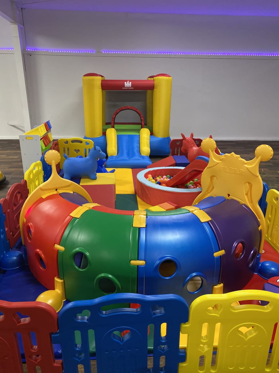 Toddler Soft Play set up provides an area of play for up to 10 toddlers. This set up requires a minimum of 10x10ft. of space. It includes a ball pit, toddler slide, rainbow crawler, cushioned play stations, animal hoppers, climbing caterpillar, tumbling mats, safety gates, and shoe bins.